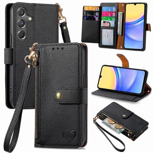 Funda para Samsung Galaxy A15 Love Zipper Lanyard de Cuero para Teléfono (Negro)