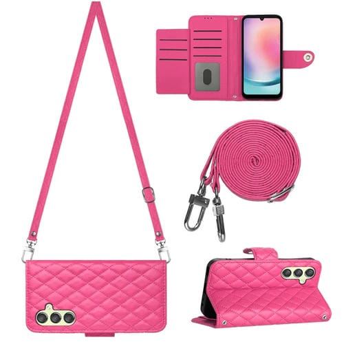 Funda de Cuero para Samsung Galaxy A24 4G con Tapa Textura Romboidal y Cordón Largo (Rojo Rosa)
