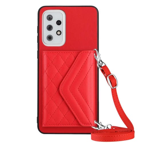 Funda para Teléfono Samsung Galaxy A33 5G con Bolsa para Tarjetas Rfid Textura Rómbica y Cordón Largo (Rojo)
