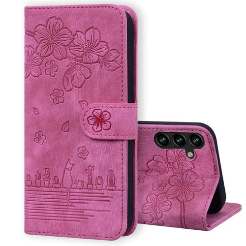 Funda para Teléfono Samsung Galaxy A35 5G Cuero Relieve Gato Sakura Dibujos Animados (Rojo Rosa)
