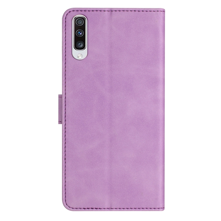 Caja de teléfono de cuero para Samsung Galaxy A50 Seven Butterflies en relieve (Púrpura)