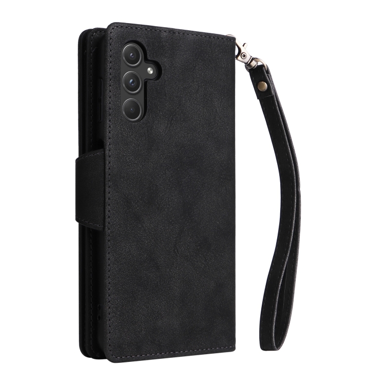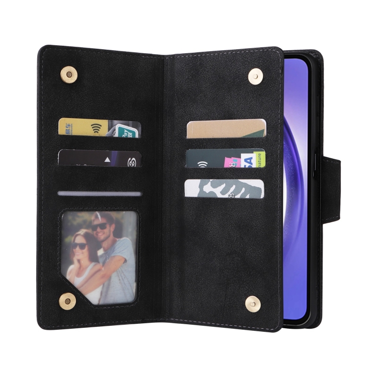 Funda de Cuero Samsung Galaxy A55 con Hebilla y Remache para 9 Tarjetas Billetera de 3 Pliegues (Negro)