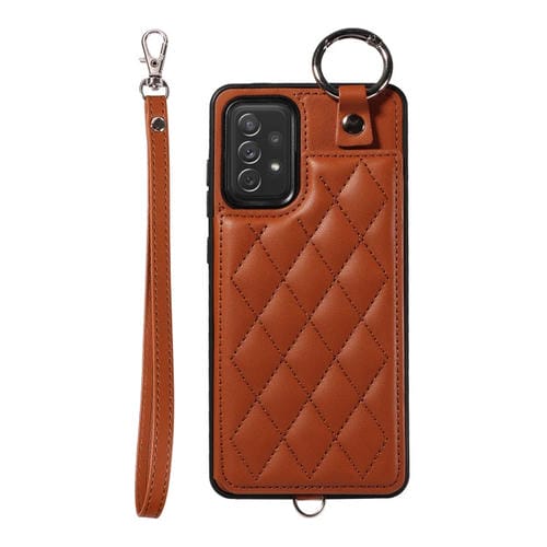 Estuche para teléfono Samsung Galaxy A72 4G / 5G con bolsa para tarjetas textura rómbica y cordón corto (Marrón)