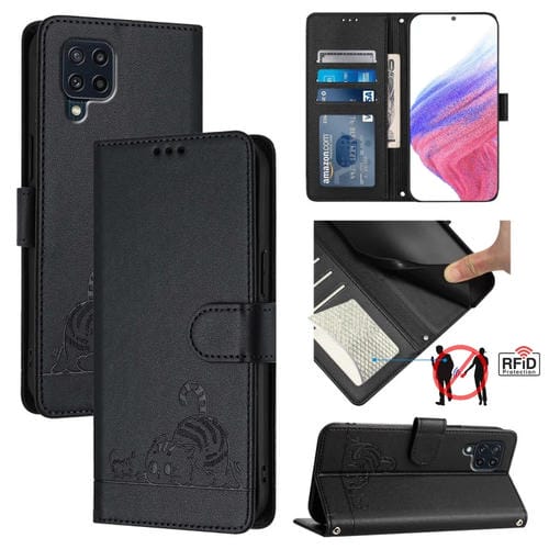 Estuche para Teléfono Samsung Galaxy M32 4G Global y M22 Cuero Rfid Patrón En Relieve con Cordón (Negro)
