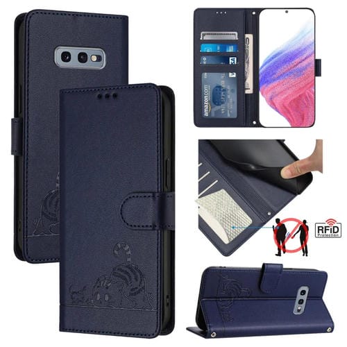 Estuche para Teléfono Samsung Galaxy S10E Cat Rat Cuero Rfid Patrón en Relieve y Cordón (Azul)