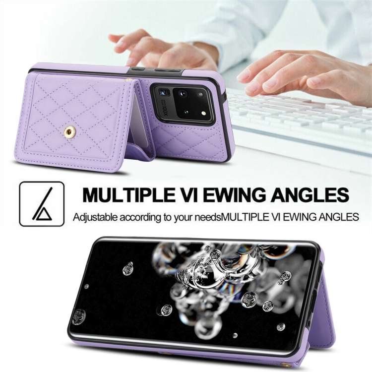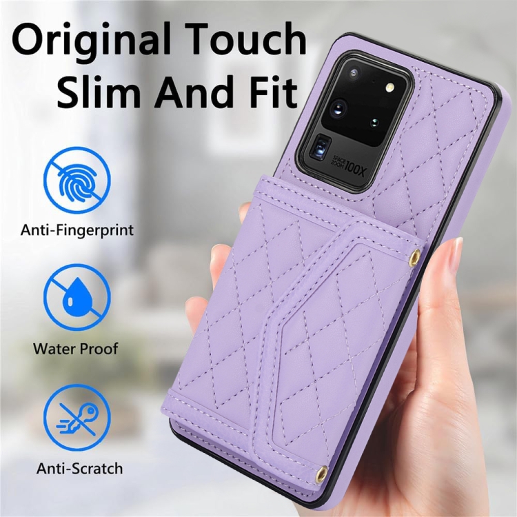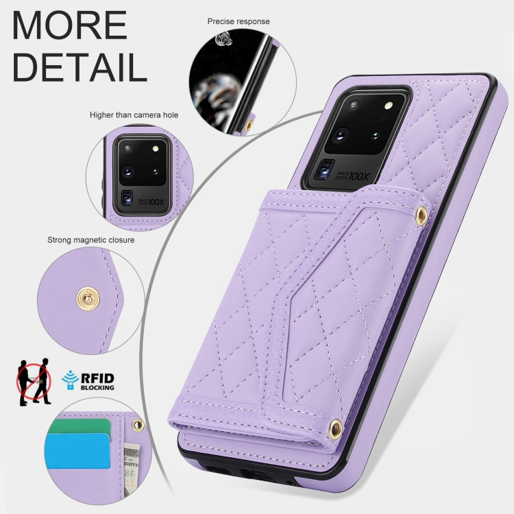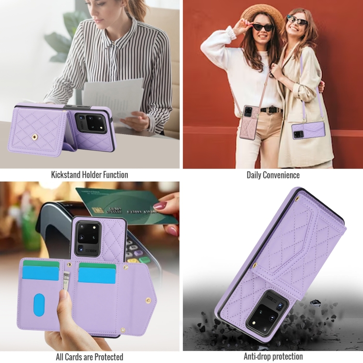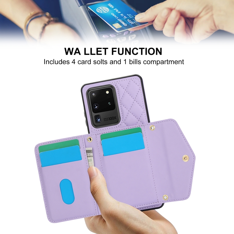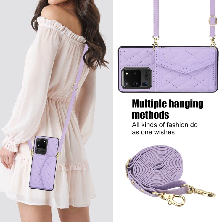 Estuche para teléfono Samsung Galaxy S20 Ultra Empalme con Textura Rómbica y Bolsa para Tarjetas con Cordón Largo (Púrpura)