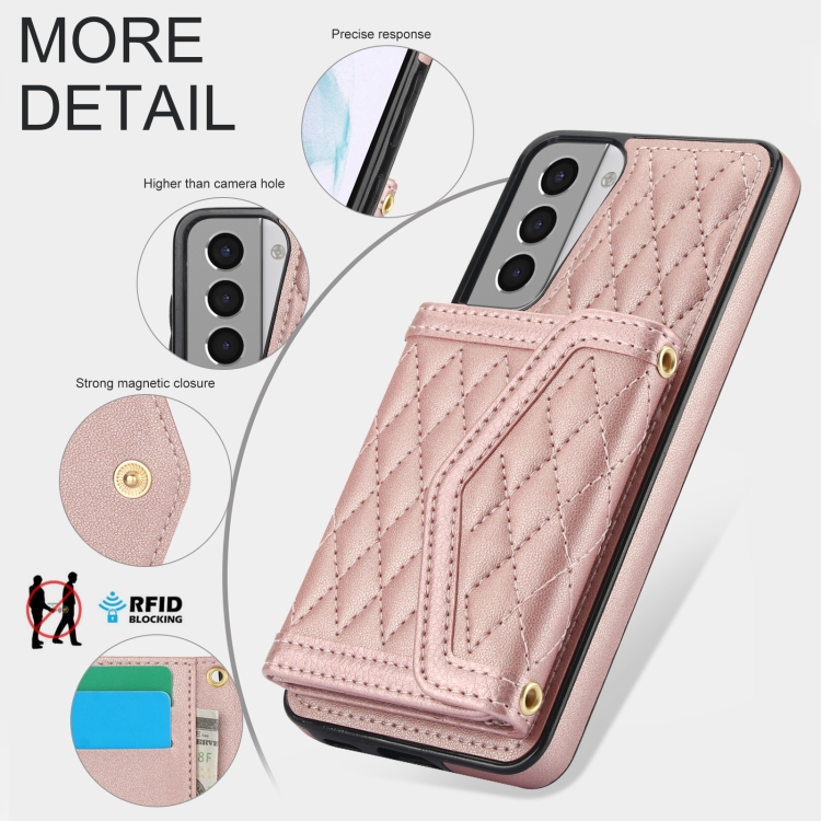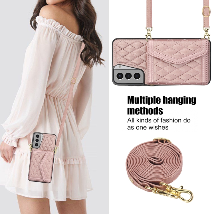 Estuche para Teléfono Samsung Galaxy S21 5G con Bolsa para Tarjetas Textura Rómbica y Cordón Largo (Oro Rosa)