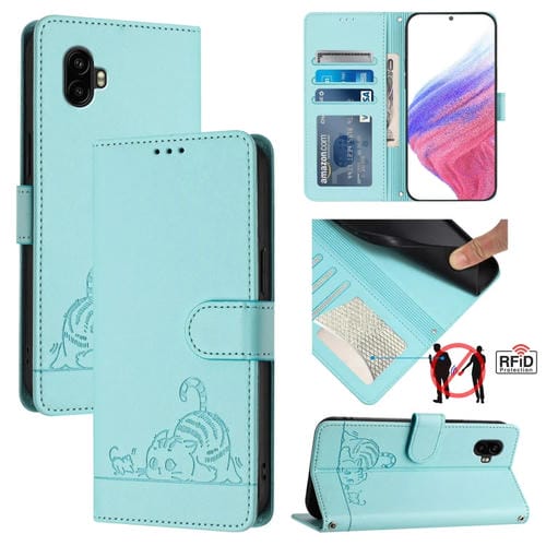Estuche para Teléfono Samsung Galaxy Xcover6 Pro Cat Rat con Patrón en Relieve Rfid PU y Correa para la Muñeca (Verde Menta)