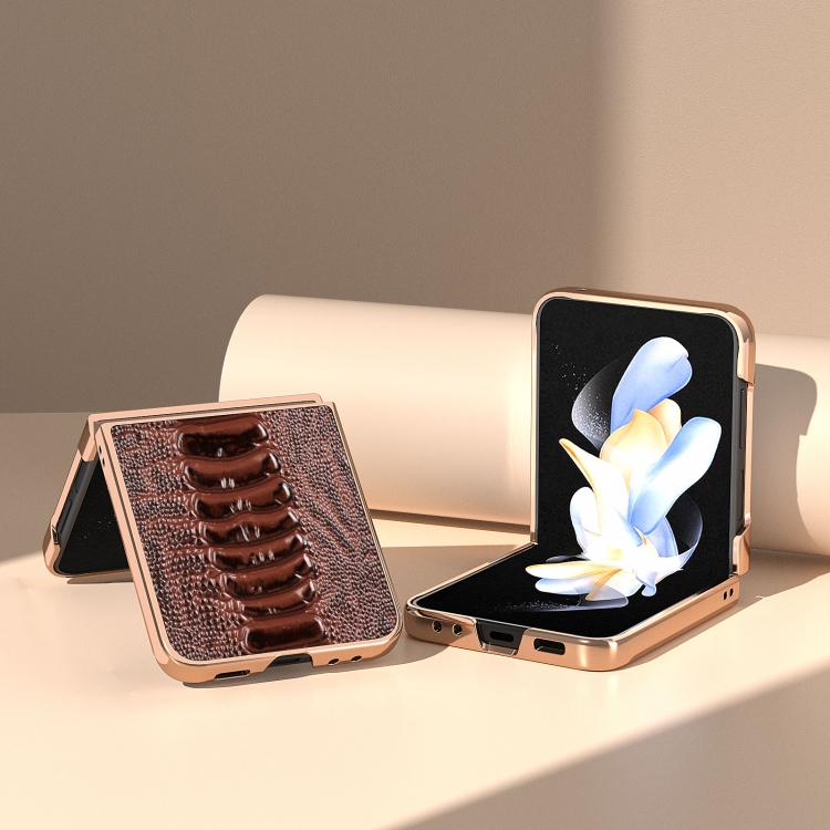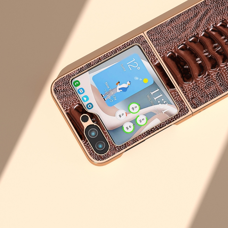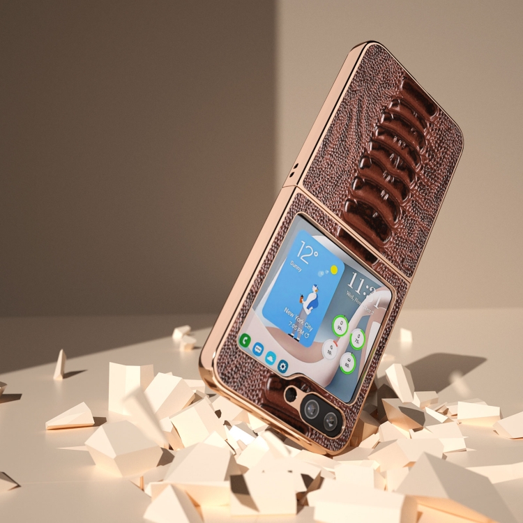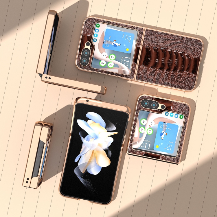 Funda de Teléfono Samsung Galaxy Z Flip5 Galvanoplastia Nano Serie Weilai Cuero Genuino (Café)