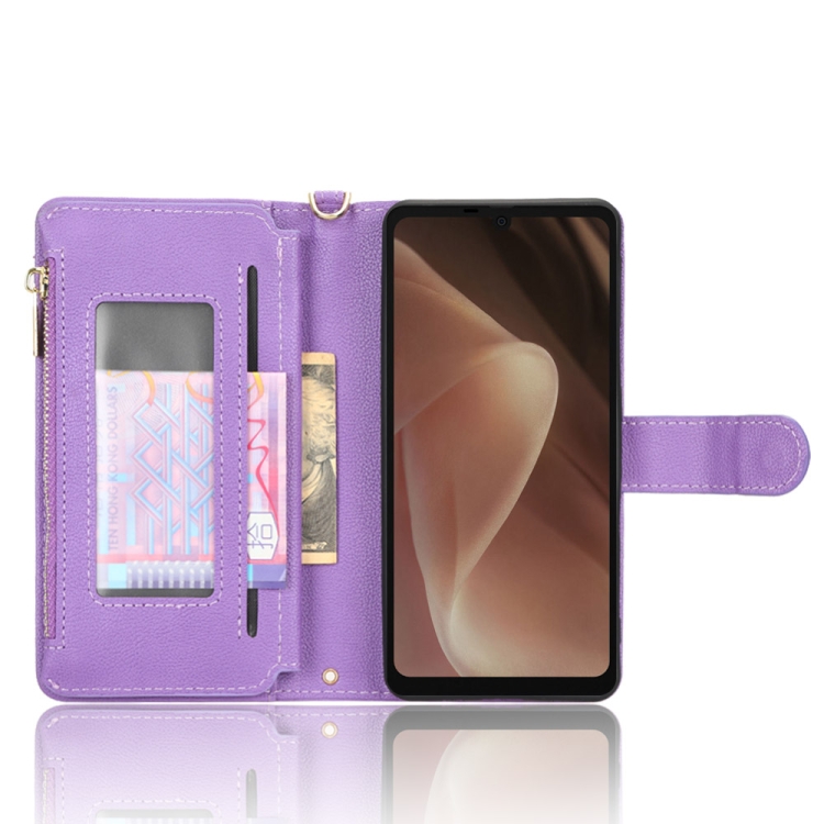 Funda de Cuero para Sharp Aquos Sense7 Plus con Textura Litchi y Cremallera (Púrpura)