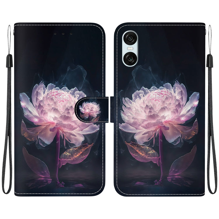Estuche de Cuero para Sony Xperia 5 Vi con Dibujo Coloreado y Textura de Cristal (Peonía Púrpura)