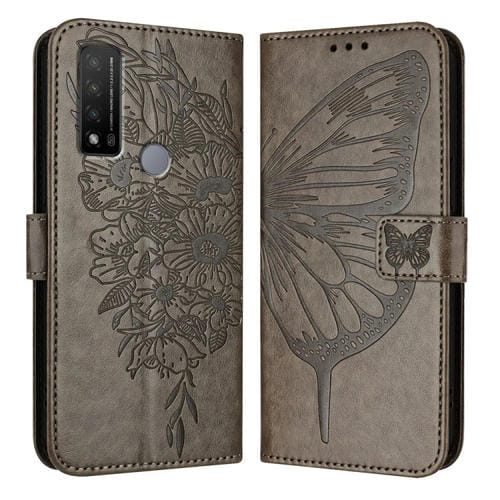 Funda de Cuero para TCL 20 R 5G con Mariposa en Relieve (Gris)