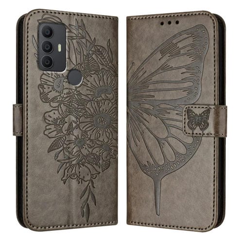 Funda de Teléfono para TCL 306 Cuero con Mariposa en Relieve (Gris)