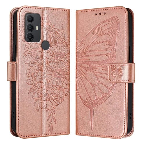 Funda de Cuero para TCL 306 con Mariposa en Relieve (Oro Rosa)
