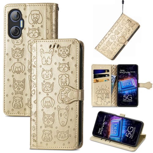 Funda de Cuero Tecno Pova Neo 5G Cat and Dog en Relieve (Oro)
