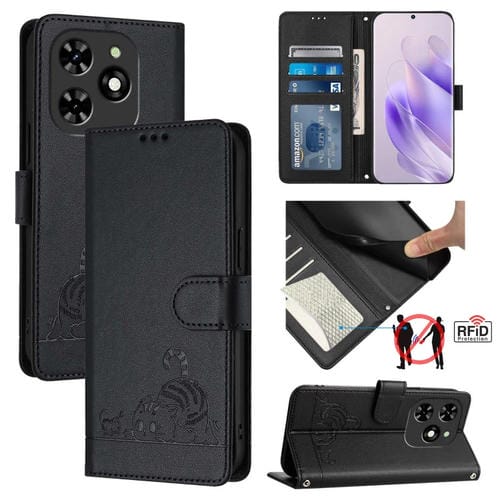 Funda para Tecno Spark 20C Cat Rat de Cuero RFID con Patrón en Relieve y Cordón (Negro)