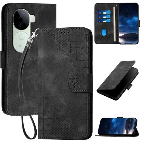 Para Vivo Iqoo Z9S / V40E India Yx0080 Funda de Cuero con Tapa y Patrón En Relieve de Mariposa y Cuadrícula con Cordón (Negro)