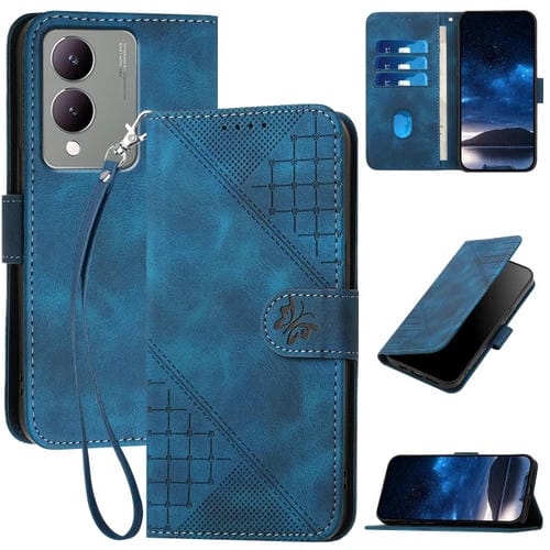 Para Vivo Y28 5G India Yx0080 Funda de Cuero con Tapa y Patrón En Relieve de Mariposa y Cuadrícula con Cordón (Azul Oscuro)