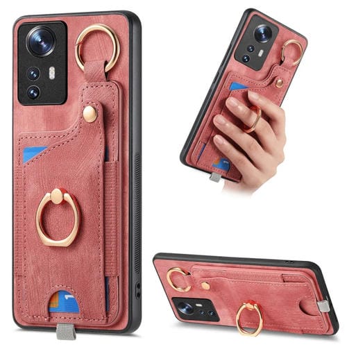 Para Xiaomi 12 Funda para Teléfono con Bolsa para Tarjeta con Anillo y Sensación de Piel Retro con Lazo para Colgar (Rosa)