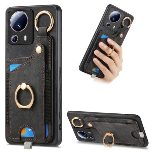 Para Xiaomi 13 Lite Funda para Teléfono con Bolsa para Tarjeta con Anillo y Sensación de Piel Retro con Lazo para Colgar (Negro)