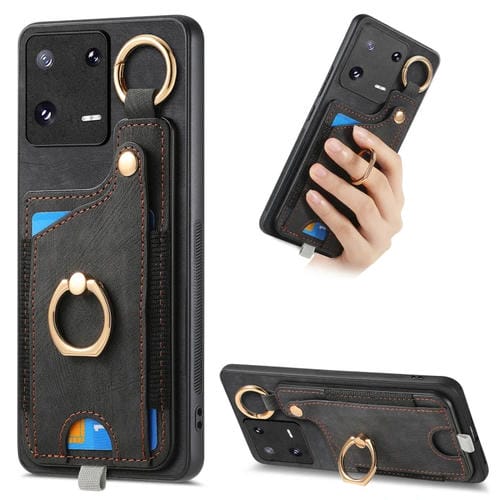 Para Xiaomi 13 Pro 5G Funda para Teléfono con Bolsa para Tarjeta con Anillo y Sensación de Piel Retro con Lazo para Colgar (Negro)