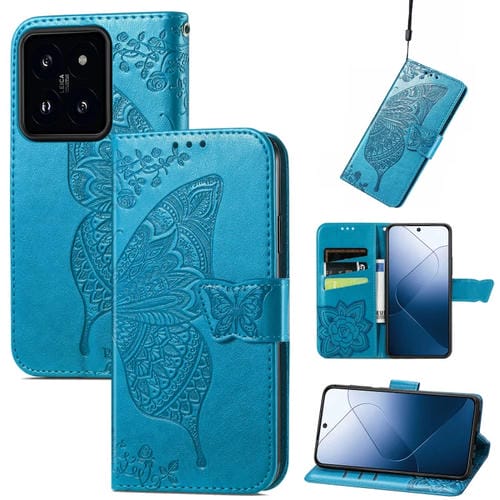 Para Xiaomi 14 Funda De Teléfono De Cuero Con Relieve De Flor De Amor De Mariposa (Azul)