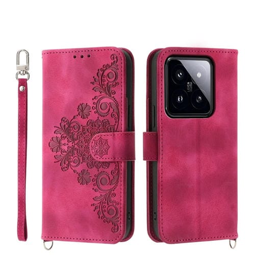 Para Xiaomi 14 Pro Funda De Cuero Para Teléfono Con Billetera En Relieve Y Flores Con Sensación De Piel (Rojo Vino)