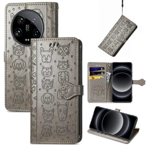 Para Xiaomi 14 Ultra Funda Para Teléfono De Cuero Con Relieve De Gato Y Perro (Gris)