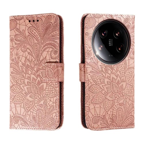 Para Xiaomi 14 Ultra Lace Flower Embossed Flip Funda De Cuero Para Teléfono (Oro Rosa)