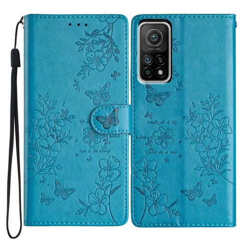 Para Xiaomi Mi 10T 5G Funda de Cuero para Teléfono con Mariposas y Flores (Azul)
