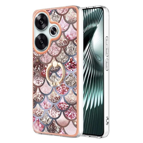 Para Xiaomi Poco F6 5G Estuche a Prueba de Golpes con Patrón de Galvanoplastia Imd TPU con Soporte de Anillo de Diamantes de Imitación (Escamas Rosas)
