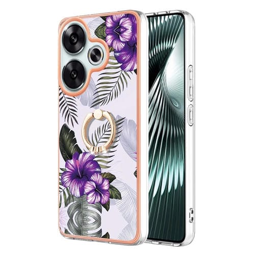 Para Xiaomi Poco F6 5G Estuche a Prueba de Golpes con Patrón de Galvanoplastia Imd TPU con Soporte de Anillo de Diamantes de Imitación (Flor Morada)