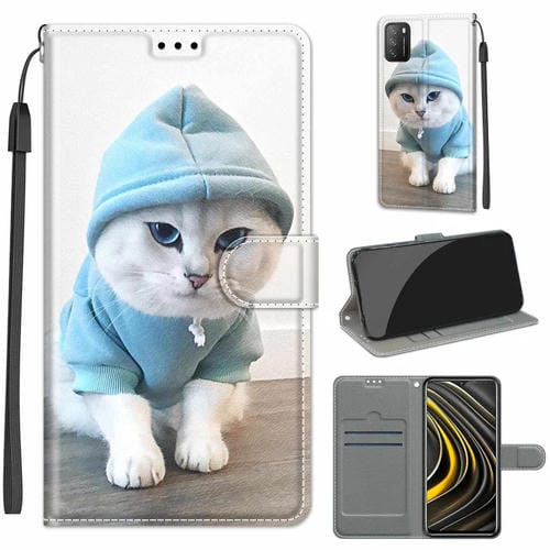 Para Xiaomi Poco M3 Voltaje de Color Dibujo Magnético Cierre Magnético Flip Pu Funda de Cuero con Soporte y Ranuras de Tarjetas (C15 Suéter Azul Blanco Gato)