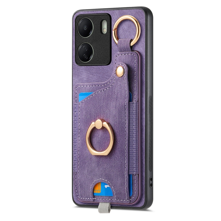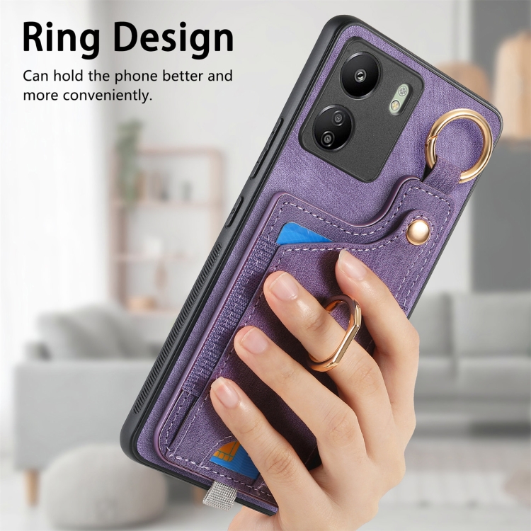 Para Xiaomi Poco M5 4G Funda para Teléfono con Bolsa para Tarjeta con Anillo y Sensación de Piel Retro con Lazo para Colgar (Púrpura)
