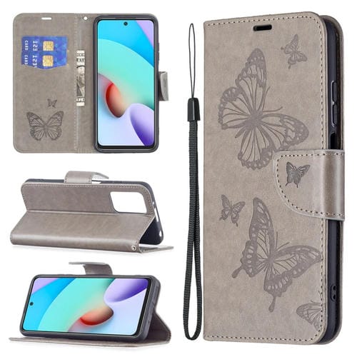 Para Xiaomi Redmi 10 Dos Mariposas Estuche de Cuero Horizontal Flip Flip con Titular y Tarjeta Slot & Wallet & Lanyard (Gray)
