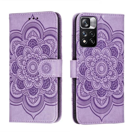 Para Xiaomi Redmi Note 11 Pro Sun Mandala Estuche de Cuero con Patrón de Estampado En Relieve con Soporte y Ranuras para Tarjetas y Billetera y Cordón (Púrpura)