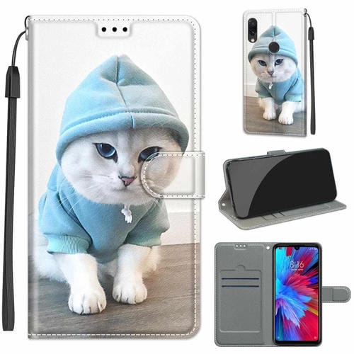 Para Xiaomi Redmi Note 7 Voltaje Dibujo de Color Magnético Cierre Magnético Flip Pu Funda de Cuero con Soporte y Ranuras para Tarjetas (C15 Suéter Azul Blanco Gato)