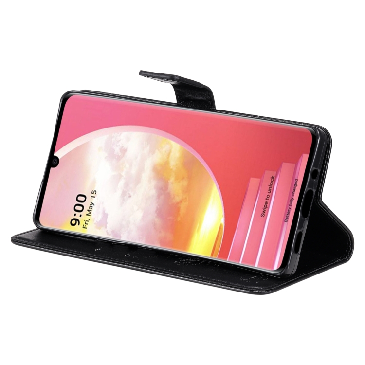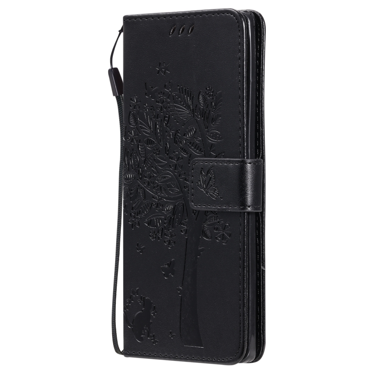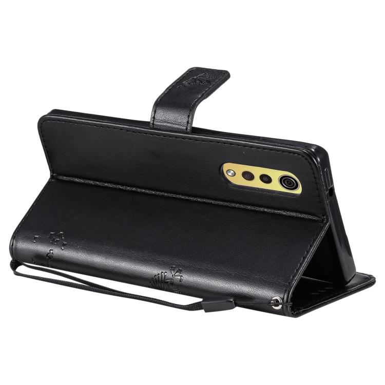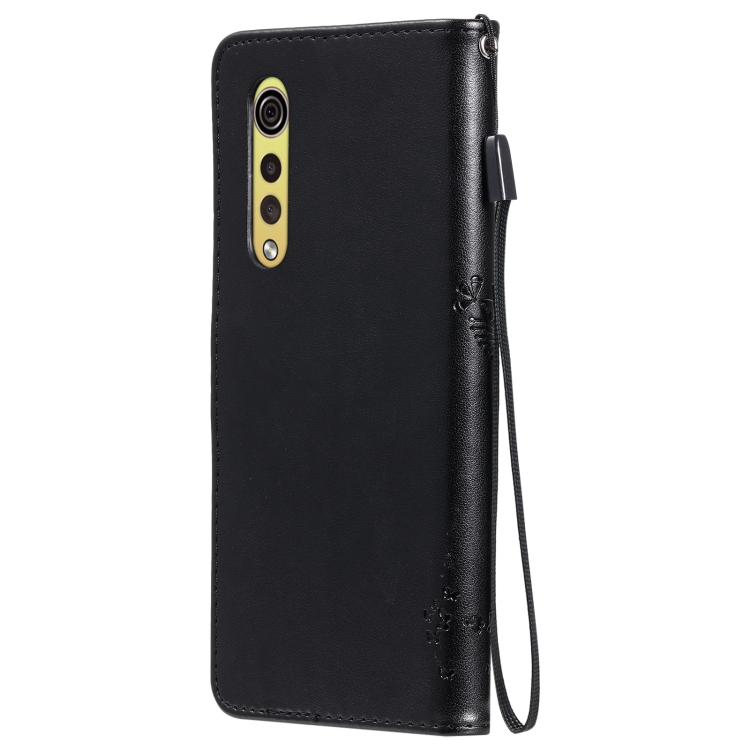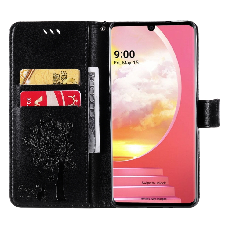 Funda de Cuero PU LG Velvet 2 Pro con Patrón Árbol y Gato, Soporte, Tarjetero y Cordón (Negro)