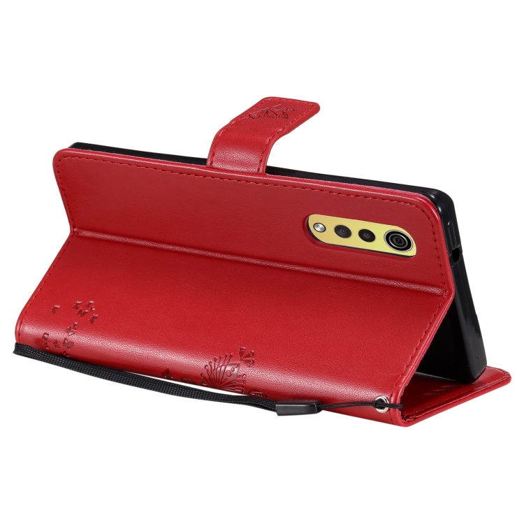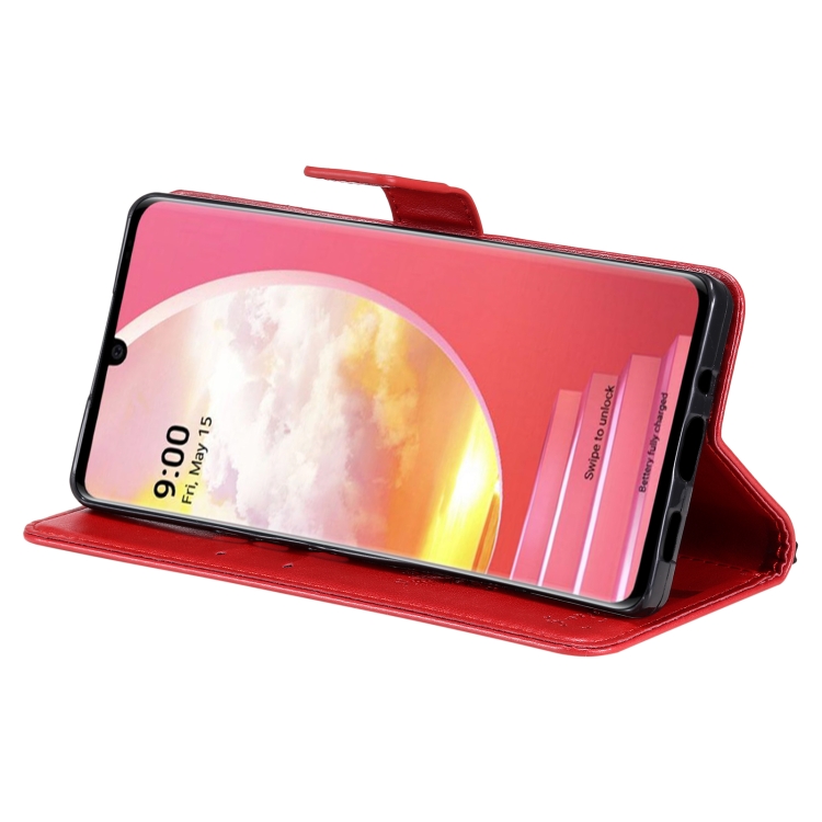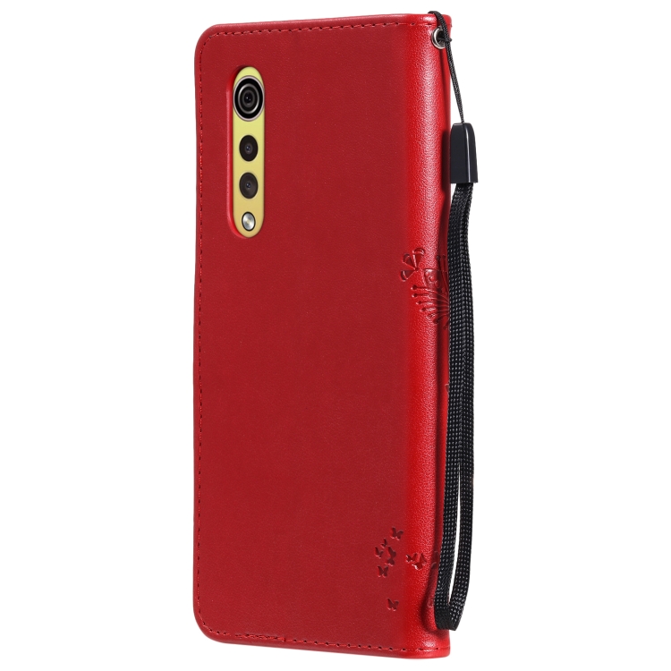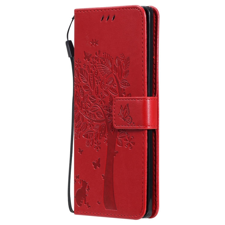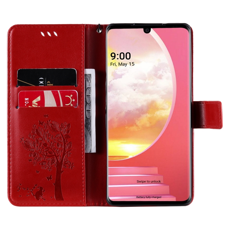 Funda de Cuero PU con Soporte, Tarjetero y Cordón para LG Velvet 2 Pro (Rojo) con Patrón Árbol y Gato