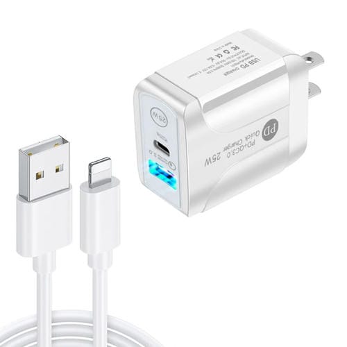 Cargador Pd25W Usb-C Tipo-C y Qc3.0 con Doble Puertos USB y Cable de Datos USB a 8 Pin (Blanco)