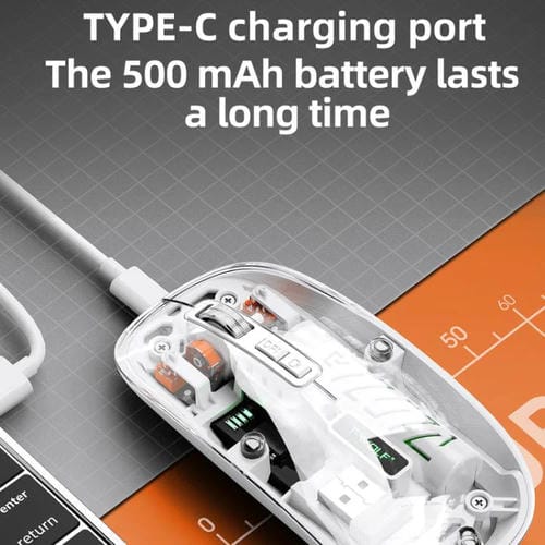 1. Este ratón inalámbrico transparente de modo dual combina un diseño vanguardista con versatilidad, compatible con conectividad 2.4G y Bluetooth de modo dual para una compatibilidad con múltiples dispositivos.