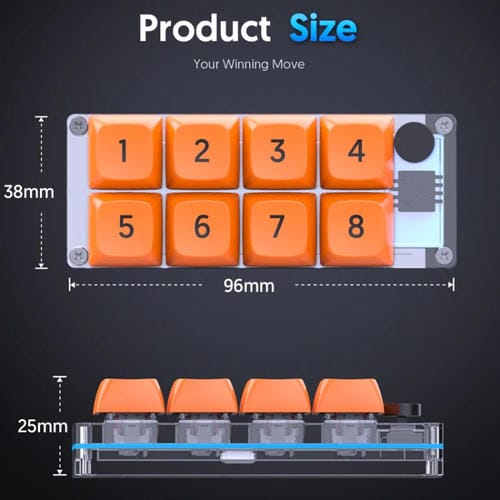 • 8 teclas programables con macros, diseño intercambiable en caliente compatible con interruptores de 3 o 5 pines, Cable de aproximadamente 1 metro, peso aproximado de 150 gramos, tamaño de 9,6x3,8x2,5 cm, 4 modos de efectos de luz multicolor