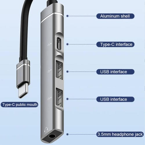 La estación de acoplamiento Hub USB-C (Tipo-C) a 3,5 mm con 2 Puertos USB en color Plata es un Accesorio diseñado para ampliar la conectividad de dispositivos compatibles con Puerto USB-C. Fabricada con una combinación de aleación de aluminio y TPE, esta estación permite conectar simultáneamente periféricos como Mouse externo, Teclado, discos flash USB y discos duros, facilitando la transmisión rápida y estable de datos. Su función Principal es ofrecer una solución compacta y eficiente para usuarios que requieren múltiples conexiones a través de un solo Puerto USB-C, manteniendo una baja latencia y un funcionamiento plug and play sin complicaciones.