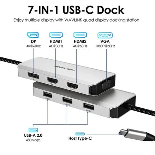 - 1x Convertidor USB-C a Dual HD 4K 60Hz Wavlink UMD304 Hub 7 en 1 Estación de Acoplamiento para Computadora Portátil