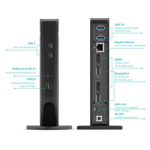 • Interfaz USB 3.1 Gen1 tipo C y estándar tipo A; 2 Puertos DisplayPort 1.2; 2 Puertos HDMI 2.0; Soporte para Pantalla única 5K@60Hz o dual 4K@60Hz; Puerto Ethernet RJ45 Gigabit; interfaz de audio 2 en 1; 3 Puertos USB-A 3.0; 2 Puertos USB-C; dimensiones 192 mm x 148 mm x 26,20 mm; Alimentación DC 20V/5A; luz LED azul
