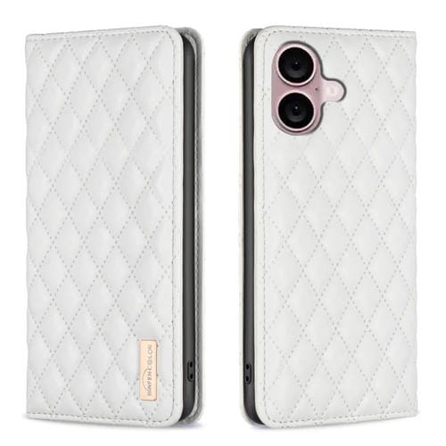 Funda para Teléfono iPhone 16 con Tapa de Cuero Magnético Diamond Lattice (Blanco)