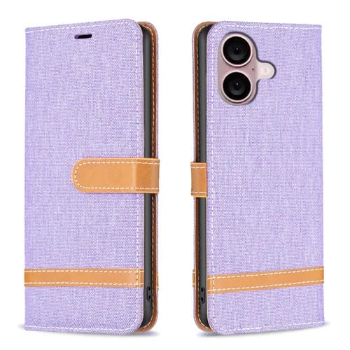 Funda para Teléfono iPhone 16 Cuero Textura Vaquera Bloques de Color (Púrpura)