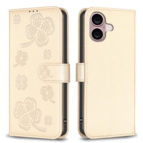 Funda para Teléfono iPhone 16 Cuero con Relieve de Cuatro Hojas (Dorado)
