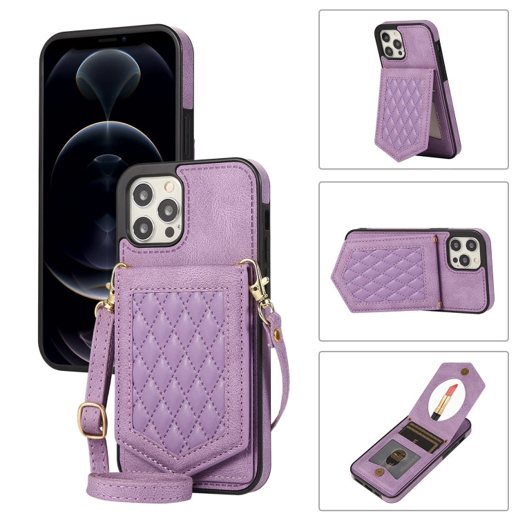 Funda para iPhone 12 Pro Max Rhombic Texture Rfid con Cordón y Espejo (Púrpura)