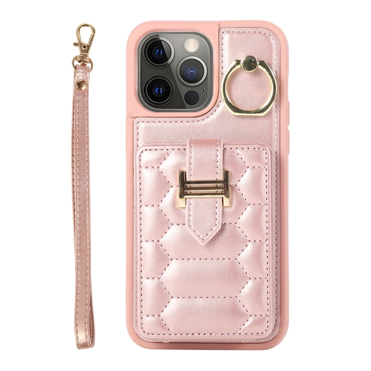 Funda para iPhone 12 Pro Max Vertical Card Bag Ring Holder con Doble Cordón (Oro Rosa)